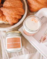 Our 'buttery croissant' candle is hand-poured and topped with mini handmade croissant shaped wax melts, so every candle is unique and different.