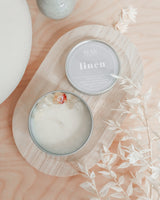 Meet our signature 'linen' scent in a compact travel tin. Imagine freshly washed laundry, dried by the sun on a hot summer day.