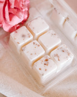 Our wax melts are housed in a 6 cavity square clam shell made from 86% recycled materials. We added a bit of crushed dried rose petal leaves, for an extra rosie touch.
