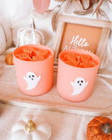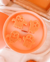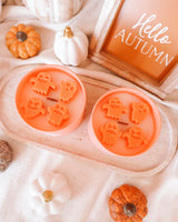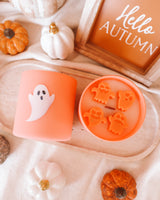 Our ‘spooky season’ candle comes in a matte orange glass jar, is hand-poured and topped with handmade orange ghost shaped wax melts and gold glitter. This ensures every candle is unique and different (one of a kind).
