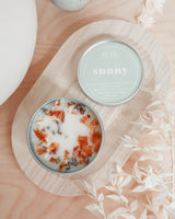 Meet our signature 'sunny' candle in a compact reusable travel tin. This scent will transport you to crisp and sunny walks, picking fruit as you go. With a mix of rich and juicy aromas of fig, citrus and vetiver, it truly adds a fresh warm scent to your home. Our sunny candle is topped with dried rose petal leaves and our candles are hand-poured, so every candle is unique and different.