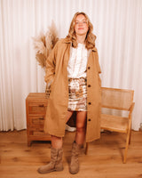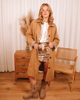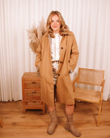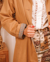 • This charming long trench coat in camel features a fun checkered lining for a subtle pop of pattern