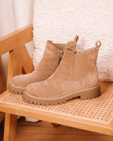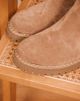 • Light camel colored suède chelsea boots with stitching details around the bottom