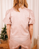 • Rose colored blazer with poofy short sleeves and silver shimmer