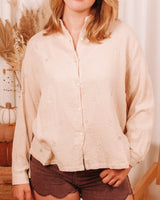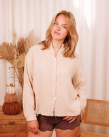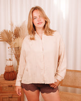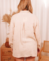 • Beige oversized muslin blouse with silver heart embroidery