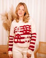 • Beige & red striped sweater with swirly detail on the front
