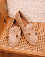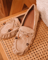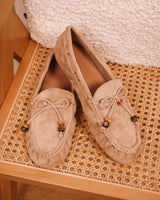 • Pale taupe colored suède loafers with beaded details