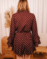 • Purple-brown polka dot dress with flowy bottoms & adjustable waist strap