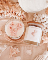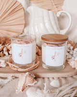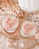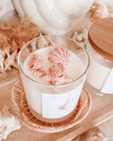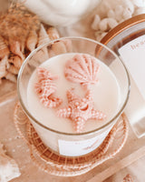 Our ‘beach bum’ candle comes in a clear glass jar with a wooden lid and is hand-poured and topped with handmade seashell shaped wax melts. This ensures every candle is unique and different (one of a kind).