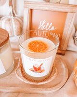 Our ‘spiced orange’ candle comes in a clear glass jar with a wooden lid and is hand-poured and topped with a handmade orange slice shaped wax melt and gold glitter. This ensures every candle is unique and different (one of a kind).