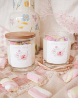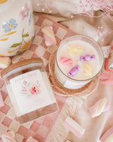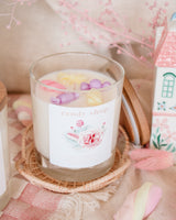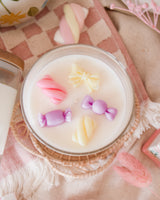 Our ‘Candy Shop’ candle comes in a clear glass jar with a wooden lid and is hand-poured and topped with handmade candy shaped wax melts and subtle glitter. This ensures every candle is unique and different (one of a kind).