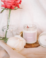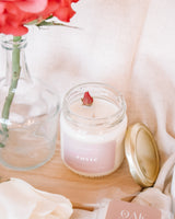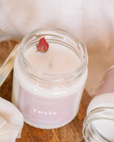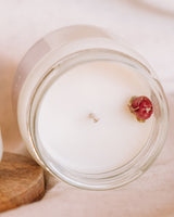 Our 'rosie' candle is hand-poured and topped with a dried rose bud (which we recommend removing before burning), so every candle is unique and different.