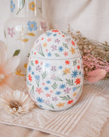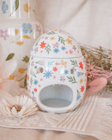 This beautiful ceramic oil burner and wax warmer is adorned with a delicate array of blooming flowers in soft pastel tones, evoking the fresh beauty of a spring garden. Featuring a unique egg-shaped design, this burner is perfect for diffusing your favourite oil or melting fragrant wax. A charming addition to home decor or a thoughtful gift for someone special at Easter. Always remove the lid whilst in use.