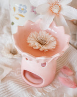 Bring a touch of nature's grace into your home with this pink water lily ceramic oil burner and wax warmer. The delicate design of this burner makes a beautiful addition to any room. Perfect for infusing your space with calming scents. Simply place a single standard tea light in the space at the back and add a few drops of diluted fragrance oil or wax melts into the bowl.