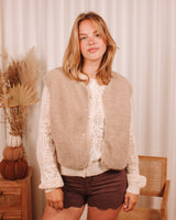 • This cozy taupe sherpa button-up vest is perfect for layering and adding a pop of style to any outfit